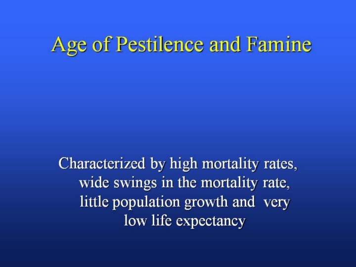 During the age of pestilence the population on a reoccurring basis is being decimated by epidemics of infectious diseases. The mortality rates drive the system. Life expectancy is low, fertility is high, but the high fertility rates are off set by very high mortality rates. |
