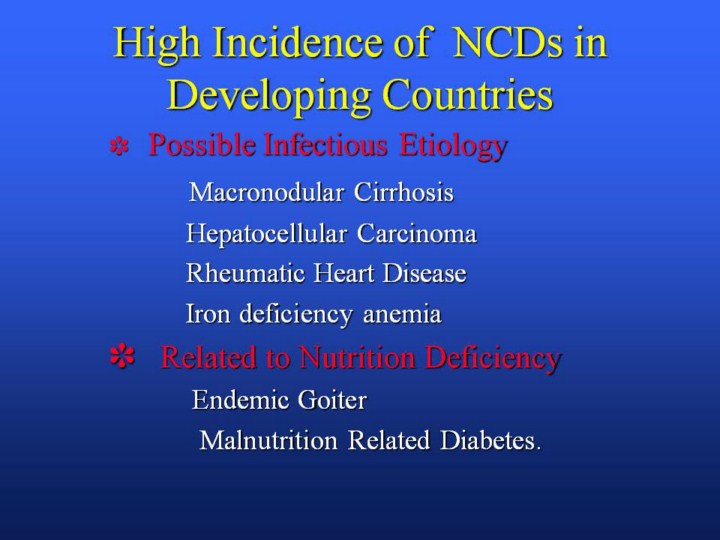 Developing countries have a very different pattern. Their diseases are primarily associated undernutrition and infection, whereas developing countries are related to overnutrition.