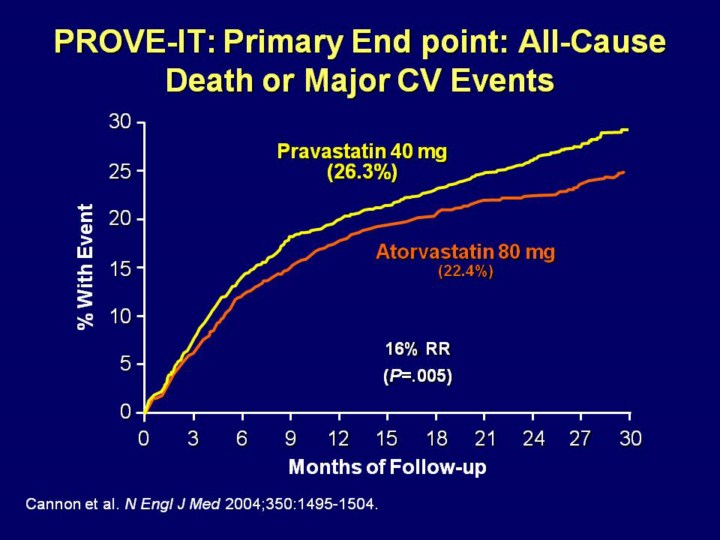 Kaplan-Meier estimates of the rates of the primary end-point (all-cause death, or major CV events) at two years were 26.3% in the pravastatin group and 22.4% in the atorvastatin group, reflecting a 16% reduction in the hazard ratio in favor of atorvastatin (p=0.005). The study thus identified the superiority of the more intensive atorvastatin regimen.