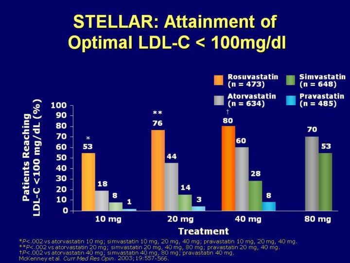 McKenney J, Jones PH, Adamczyk MA, et al for the STELLAR Study Group. Comparison of the efficacy of rosuvastatin versus atorvastatin, simvastatin and pravastatin in achieving lipid goals: results from the STELLAR trial.Curr Med Res Opin. 2003;19:557-566.