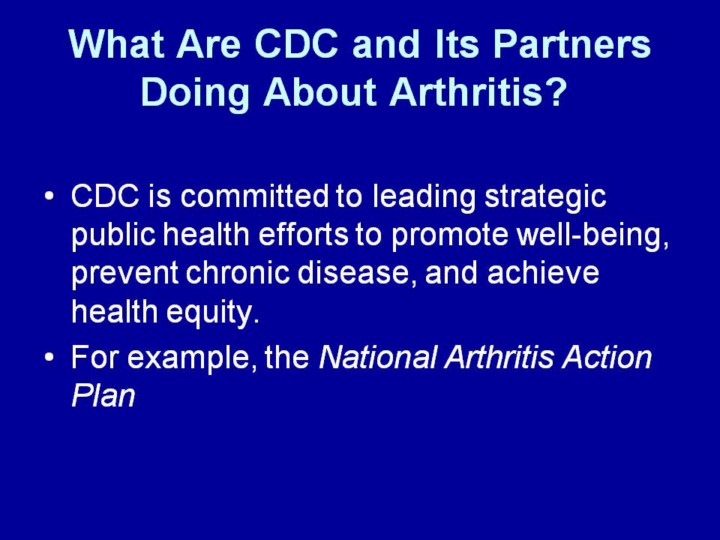 What Are CDC and Its Partners Doing About Arthritis? CDC is committed to leading strategic public health efforts to promote well-being, prevent chronic disease, and achieve health equity. With $13 million in fiscal year 2008 funding, CDC is working with the Arthritis Foundation and other partners to improve the quality of life for adults with arthritis and to change people’s attitudes and behaviors related to self-management. For example, the National Arthritis Action Plan: A Public Health Strategy was developed by CDC, the Arthritis Foundation, the Association of State and Territorial Health Officials, and 90 other organizations to address the growing problem of arthritis. By implementing the goals of the action plan, CDC and its partners are moving toward achieving the first-ever arthritis-related national objectives outlined in Healthy People 2010. |
