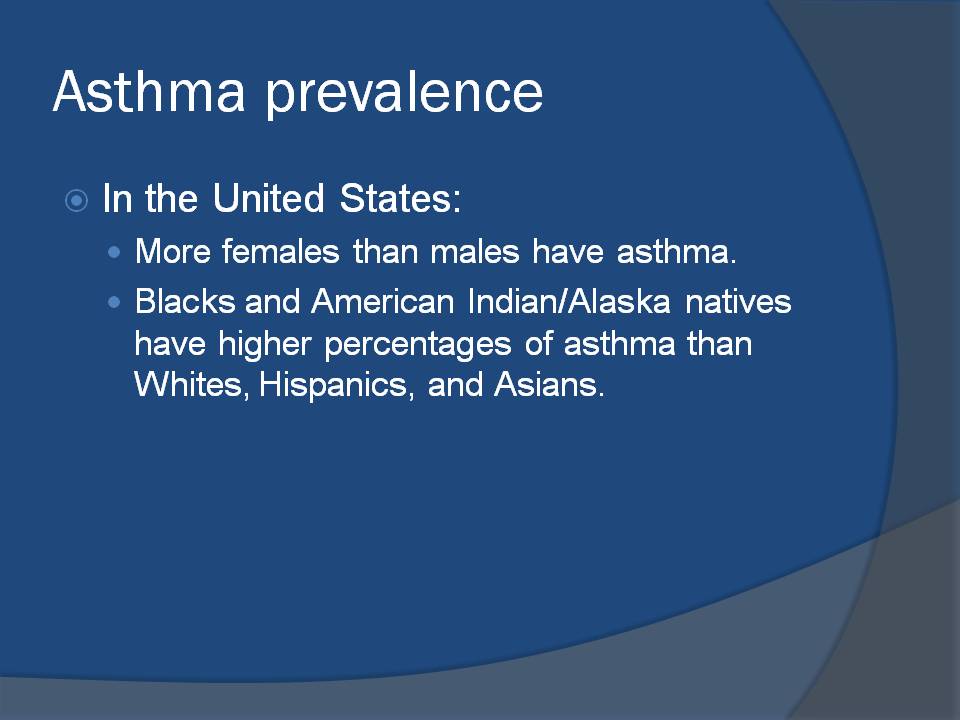 Asthma is more prevalent in women than in men. Asthma is more prevalent in Blacks and American Indian/Alaska natives than in Whites, Hispanics, and Asians. |