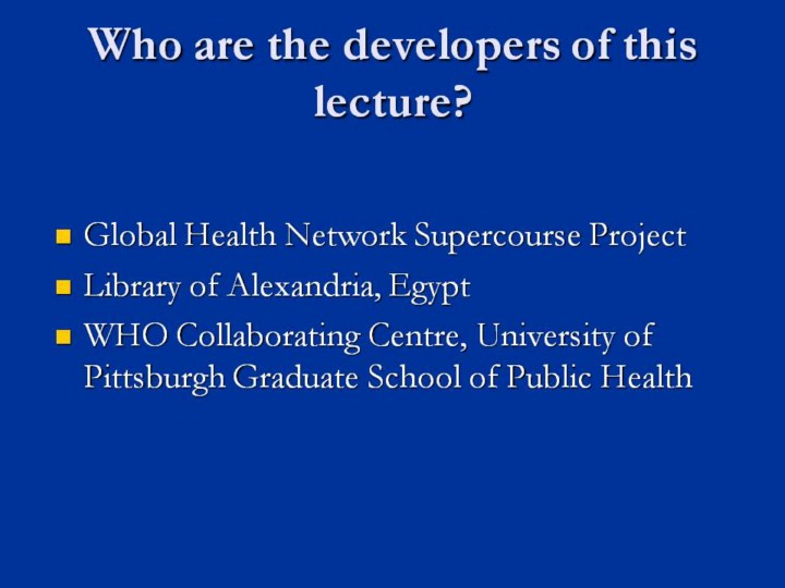 Global Health Network Supercourse Project is collaborating with the Library of Alexandria in Egypt to develop one of the largest repositories of Global Health Lectures. On the Pittsburgh side, the majority of of the work is being done through the WHO Collaborating Centre for disease monitoring and telecommunications, under the direction of Dr. Ronald LaPorte. |
