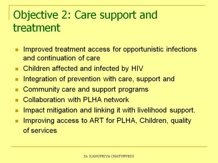 Under NACP–II, focus was given on low-cost care, support and treatment of common OIs. Apart from further improving the availability, accessibility and affordability of ART treatment to the poor, NACP-III plans to strengthen family and community care through psycho-social support to the individuals, more particularly to the marginalised women and children affected by the epidemic, improve compliance of the prescribed ART regimen, and address stigma and discrimination associated with the epidemic.