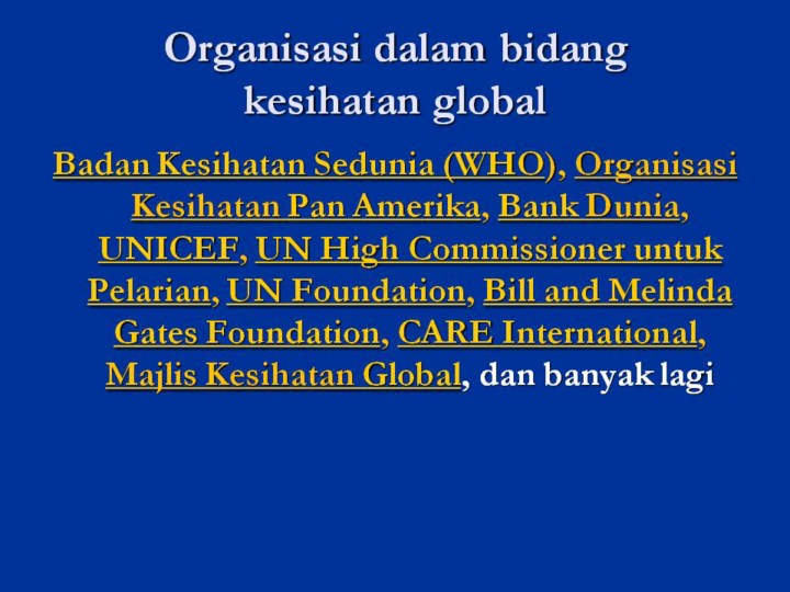 Seperti disentuh dalam bahagian yang lalu, terdapat banyak multilateral organisasi yang penting, pengasas, badan bukan kerajaan yang membincangkan masalah kesihatan secara global.
