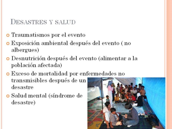 Las consecuencias de los desastres van de corto a largo plazo. Evaluación efectiva puede establecer las bases para las acciones apropiadas. Esto puede servir en disminuir la carga del desastre y fortalecer el afrontamiento. La educación en enfermería reconoce el bienestar mental por sí mismo, como un resultado, sin embargo, es también visto como la clave para el bienestar físico. |