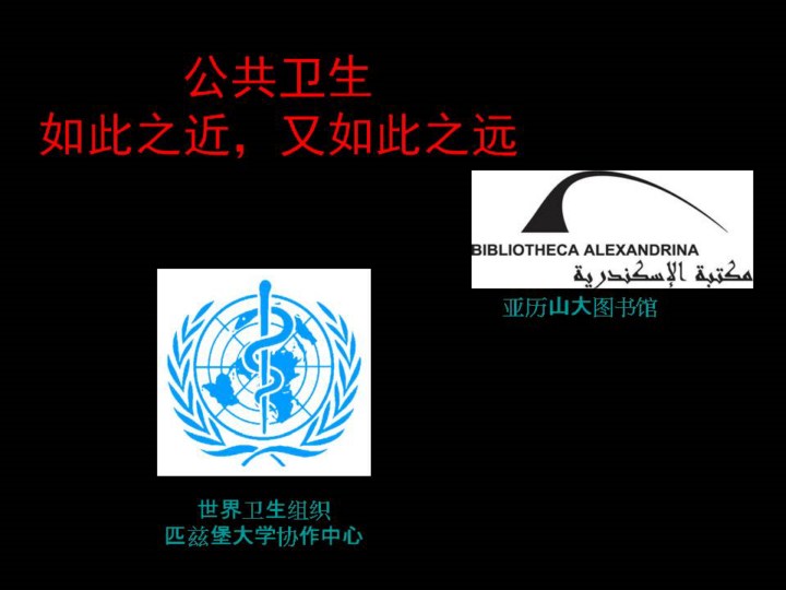 谨以此讲稿献给“GLOCAL Health”概念——将全球卫生从全球(Global)向当地(Local)转化。全球卫生网络超级课程项目正与埃及亚历山大图书馆合作开发一个最大的全球卫生主题的讲稿库。匹兹堡方面,在Ronald LaPorte教授指导下,主要的工作已经通过世界卫生组织疾病监测与远程通信协作中心完成。Faina Linkov博士负责了本讲稿的撰稿和修改。这些幻灯片试图达到以下目的:1)在医学、公共卫生及相关健康领域的工作人员和学生中建立起全球卫生(Global Health)的概念;2)为学生在本土应对全球卫生问题开发出一个全球卫生的网络。本讲稿的扩展版见Supercourse超级课程网站: www.pitt.edu/~super1/