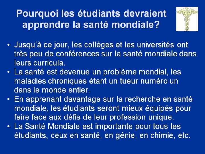 Cette conférence a été conçue pour les membres du corps professoral et des étudiants de facultés de médecine et des écoles de santé publique dans le monde entier. Toutefois, nous estimons également que les étudiants et les professeurs dans toutes les disciplines devraient se familiariser avec la santé mondiale, du moment qu’elle nous concerne tous.