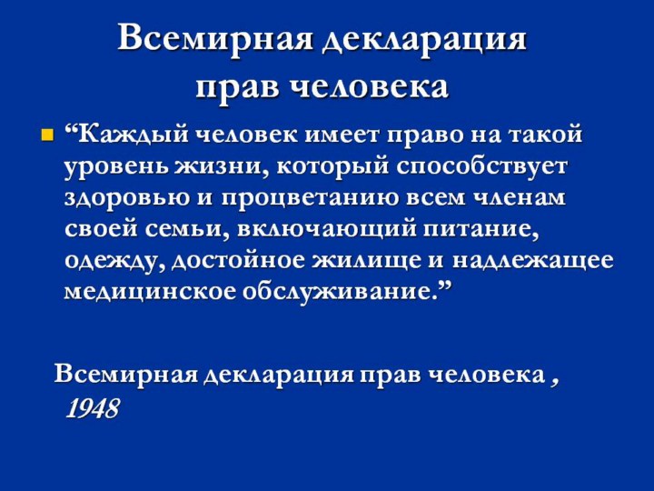Идея о том, что здоровье является правом человека была четко сформулирована в декларации прав человека, созданной более 50 лет назад, вскоре после создания ООН. Эта идея лежит в основе развития науки всемирного здоровья. Студенты, изучающие медицину, общественное здоровье, а также те, кто учится профессии медсестер, должны понимать, какой вклад в мировое здоровье они могут внести в будущем.
