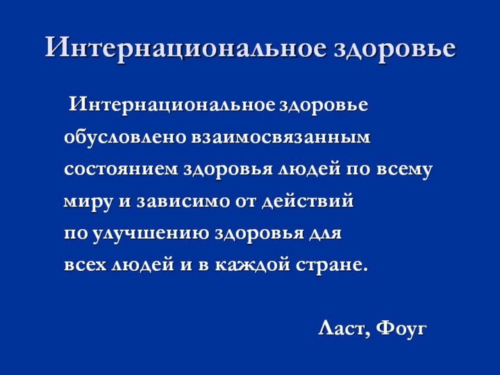 Интернациональное здоровье не может рассматриваться с учетом специфики отдельных болезней или специфики отдельных стран. Оно требует отображения всех пограничных и трансдисциплинарных условий, влияющих на здоровье. Слово «интернациональный» буквально подразумевает рамки национальных границ, тогда как слово «глобальный» по своему смыслу охватывает весь мир.