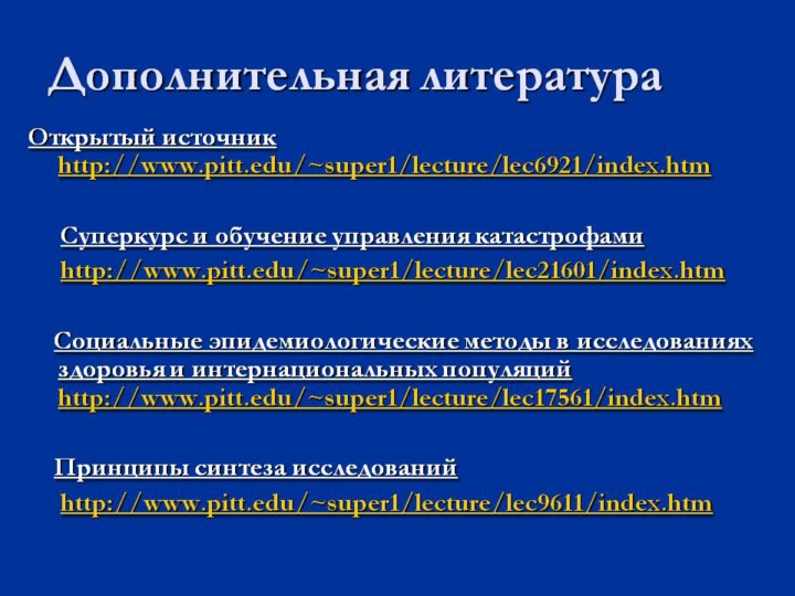 Социальные эпидемиологические методы в исследованиях здоровья и интернациональных популяций http://www.pitt.edu/~super1/lecture/lec17561/index.htm