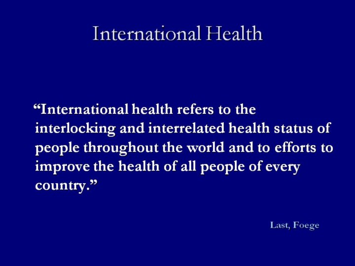 International health cannot be viewed either as disease or country specific. We need to examine all transboundary and transdisciplinary conditions that affect health. The word "international" is literally defined in terms of national borders, whereas the word "global" encompasses the entire world.
