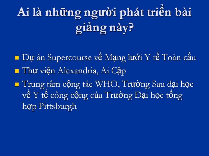 Dự án Supercoursemạng lưới y tế toàn cầu đang phối hợp với Thư viện Alexandria của Ai Cập để phát triển một trong những nguồn Bài giảng về Sức khỏe Toàn cầu lớn nhất. Về phía Pittsburg, phần lớn công việc đang được thực hiện thông qua Trung tâm hợp tác theo dơi và viễn thông bệnh của WHO, dưới sự hướng dẫn của tiến sĩ Ronald LaPorte. |