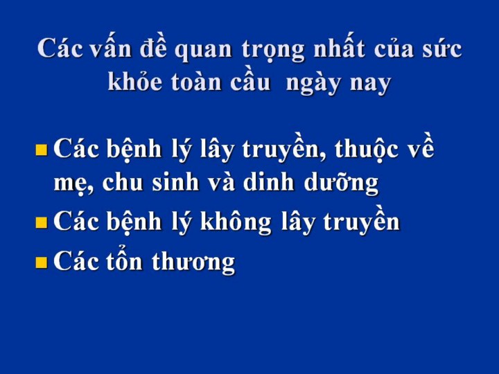 Các vấn đề quan trọng nhất của sức khỏe toàn cầu ngày nay là ǵ? Cột mốc xuất bản năm 1996, “Gánh nặng của bệnh tật toàn cầu”, đă tŕnh bày dữ kiện từ năm 1990 với sự phóng chiếu dữ kiện đến năm 2020 cho ba nhóm nguyên nhân lớn của các vấn đề sức khỏe mà, tập hợp lại, thiết lập toàn bộ gánh nặng bệnh tật của thế giới. Đó là: Nhóm 1, các bệnh lư lây truyền, thuộc về mẹ, chu sinh và dinh dưỡng; Nhóm 2, các bệnh lư không lây truyền; và Nhóm 3, các tổn thương. Trong mỗi nhóm lớn này là các bệnh lư đặc biệt.