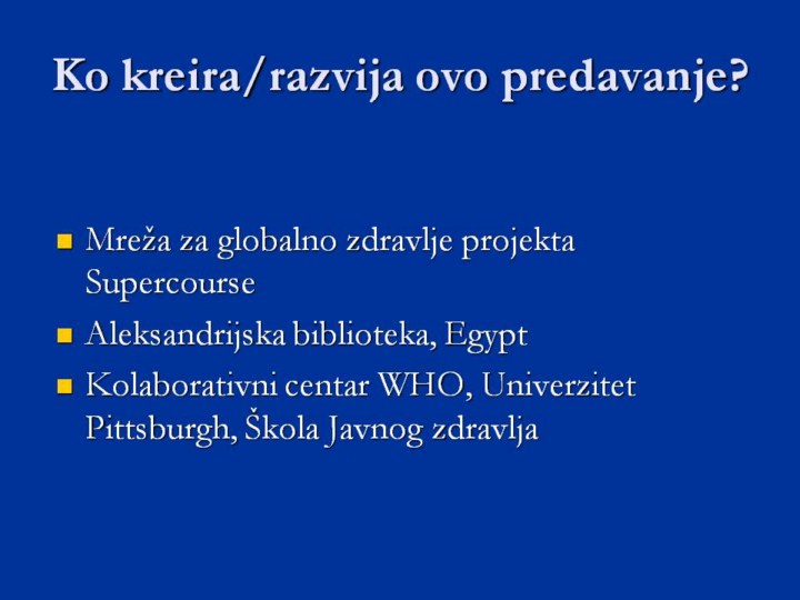 Global Health Network Supercourse Project je suradnički sa bibliotekom u Aleksandriji u Egiptu razvio jedan od najširih repozitorija predavanja o globalnom zdravlju. U Pittsburgh-u, WHO kolaborativnom centru je glavna radionica za monitoriranje bolesti i telekomunikaciju, pod liderstvom Dr. Ronald LaPorte. |