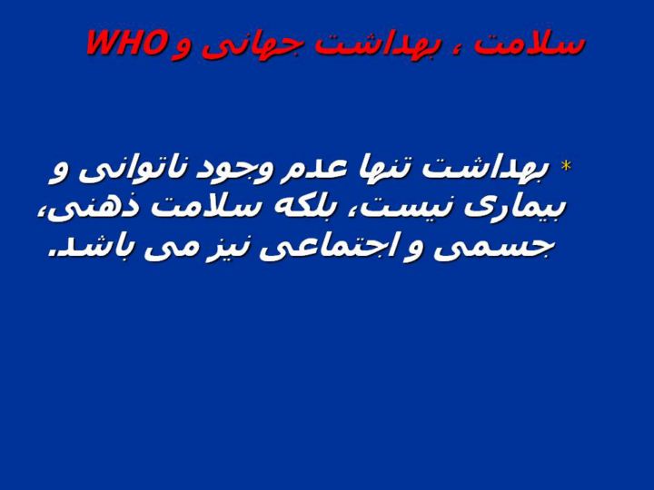 | سازمان جهانی بهداشت (WHO) معنایی کلاسیک از بهداشت را که در کشور ما و تمامی جوامع جهان بسیار حایز اهمیت است، منتشر ساخته است |