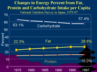 | In the US, energy intake from fat decreased from 40% to 36% or so during the same period. In Japan, even though energy intake from fat in Japan increased from 22% to 27% between 1975 and 1997, the figure in 1997 is still much lower than that in the US. |