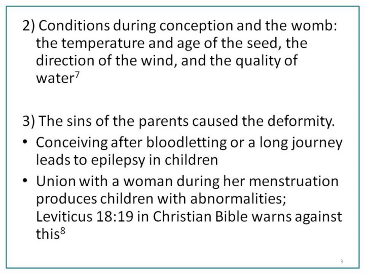 The nature of the sperm, or seed, and womb could also lead to a disabled child. Ancient authors believed condition like the strength, age, and vitality of the sperm influenced the child. Outside forces, such as the wind and water, also played an important role.9 Interestingly, they also mentioned alcohol use by the wet-nurse as a factor. Although the appearance of a child with abnormalities certainly shocked ancient families, they did not usually attribute the deformity to the child. Instead, the actions and behaviors of the parents were punished with their child’s physical appearance. The Babylonian Talmud states that conception after the father’s long journey, trip to the restroom, or bloodletting would lead to weak children.10 Likewise, the Bible warns against intercourse during a woman’s menstruation period.11 This taboo act would be punished by a disabled child. |