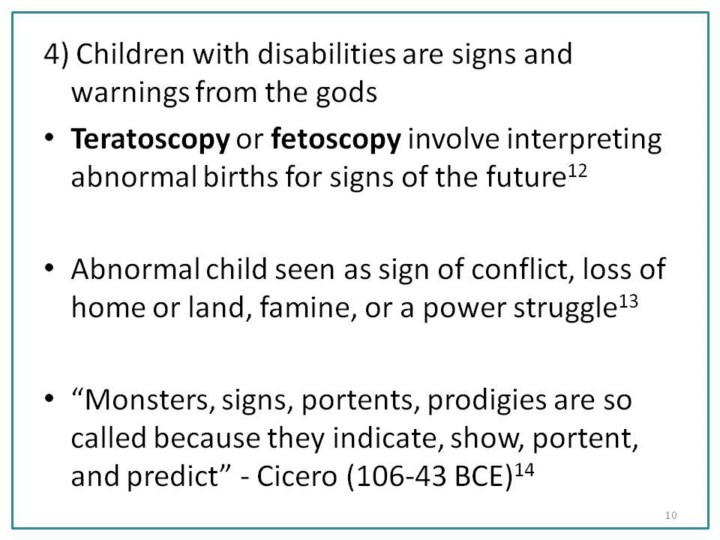 Deformed births almost always carried a negative connotation. In Babylonia, teratoscopy or fetoscopy predicted future events based upon the features of the infant15 These events could include financial ruin, war in the empire, or a loss of political or familial power. Throughout the ancient world, these births appeared as deviations from the natural order and as signs of future, important events. The word monster most likely originated from the Latin monere, which means ‘to warn’ 16 |