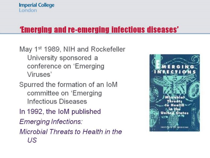In 1989, the National Institutes of Health and Rockefeller University co-sponsored a conference on ‘emerging viruses’. One of the key people behind the conference was the Nobel Laureate Joshua Lederberg. The term was later modified to ‘emerging infectious diseases’ and thus acted as an umbrella which would include underlying concerns about the appearance of new viral infections such as HIV and the resurgence of bacterial infections. The conference spurred the formation of an Institute of Medicine committee and three years later in 1992, the publication of Emerging Infections: Microbial Threats to Health in the United States. This book, co-edited by Lederberg became the most comprehensive and widely cited statement of the new emerging diseases paradigm. From the mid 1990s, the emerging infectious disease paradigm has become established, with its own journals, conferences, professors and post graduate courses. Scientists, doctros and the public now think about infectious diseases as ‘emerging’ – not as a thing of the past, but of the future. Any new infectious disease is by definition ‘emerging’, and any pre-existing infectious disease you might think of, from measles to TB – is by virtue of the fact that it still infects people – ‘re-emerging’, at least into the public consciousness, and often from the poor of the world to the rich.