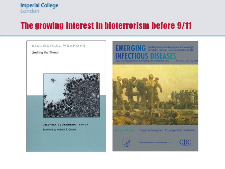 By the end of the first Gulf war in 1991, the US Congress had already passed two major statues in an effort to control and prevent the use of biological weapons by domestic and international terrorists as well as by foreign nations: The Biological Weapons Act of 1989 and The Chemical and Biological Weapons Control and Warfare Elimination Act of 1991. Interest in the potential threat of bioweapons gradually increased in the decade between the first Gulf war and the 9/11 and anthrax attacks in 2001. There were fears of both the possible use of bioterrorism against US civilians, and of the possible use of bioweapons in battle by ‘rogue states’ such as Iraq. This pitching up of the risk discourse around bioweapons between 1991 and 2001 mirrors the increasing pitch of the contemporary discourse around emerging infectious diseases, and as in the case of emerging infectious diseases, prompted a range of legislation as well as a massive increase in US government spending on related research.