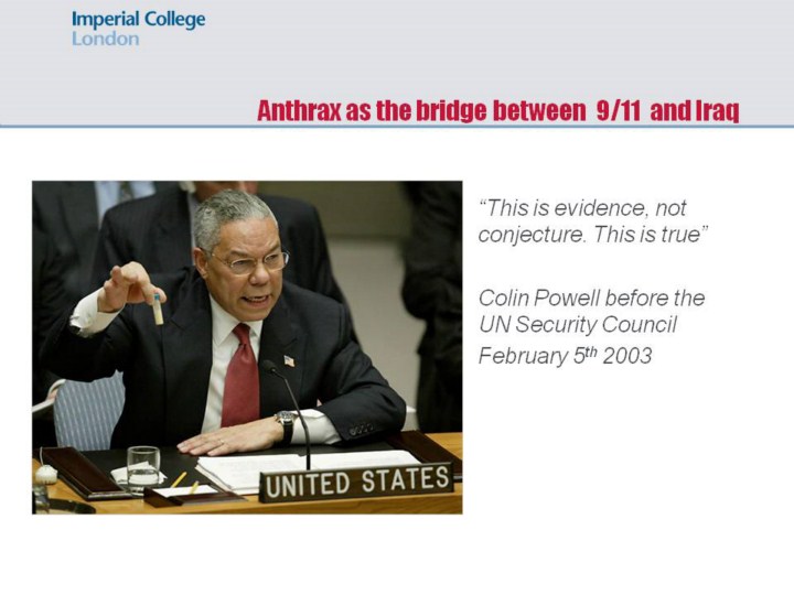 What then have been the consequences of the Anthrax attacks? Firstly, and most seriously, the anthrax letters provided a conceptual bridge between 9/11 and Iraq, or between the religious fanatics of Al-Quaeda and Osama bin Laden and the secular dictator Saddam Hussein. On 5 February 2003, before the UN Security Council, Colin Powell, in a pivotal speech arguing for war against Iraq, showed the UN delegates a small container of white powder. He said: ‘Less than a teaspoon of dry anthrax, a little bit about this amount – this is just about the amount of a teaspoon – less than a teaspoonful of dry anthrax in an envelope shutdown the United States Senate in the fall of 2001. This forced several hundred people to undergo emergency medical treatment and killed two postal workers just from an amount just about this quantity that was inside of an envelope.’ Partly as a result of Powell’s speech, the second war against Iraq – ‘Operation Iraqi Freedom’ – went ahead on 19 March. After the war, UNSCOM failed to find Weapons of Mass Destruction in Iraq. Powell is reported to have later regretted his speech at the UN, which he regarded as a ‘permanent blot’ on his record (Weisman, 2005).
