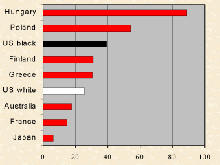 (410-414) among men aged 35-44 in 1995 in some countries and US black and white (/100,000) CHD mortality among black men aged 35-44 ranks between that in Poland and Finland. CHD mortality among white men aged 35-44 ranks between that in Greece and Australia. CHD Mortality ICD-9 (410-414) |
