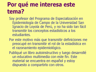 Soy profesor del Programa de Especialización en Epidemiología de Campo de la Universidad San Ignacio de Loyola de Perú, y no ha sido tan fácil transmitir los conceptos estadísticos a los estudiantes. Por este motivo más que transmitir definiciones me preocupé en transmitir el rol de la estadística en el razonamiento epidemiológico. Publiqué un libro autoinstructivo y luego desarrollé un educativo multimedia con este fin. Este material se encuentra en español y estoy dispuesto a compartirlo con otros. |