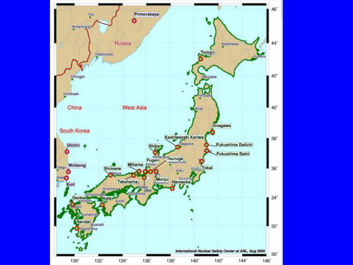Mapa de los Reactores Nucleares en Japón (Centro de Seguridad Nuclear Internacional sitio we - http://www.insc.anl.gov/ (enviado por Borys Ledoshchuk)