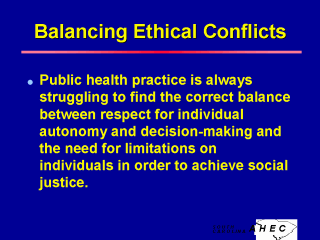This is the heart of the community decision-making that is necessary for promotion of the public’s health. We are long past the parentalistic model under which the state might appoint a health officer who can individually demand that others follow instructions with no recourse. The establishment of environmental regulations, decisions to require immunization of all children, and the move to limit or eliminate use of tobacco products all represent a balance between what individuals might prefer to do if left unchecked and actions that appear necessary for the good of the whole group. The HIV epidemic has provided us with some of the most vivid examples of this tension, including debates about disease reporting, partner notification, syringe and needle exchange and access to substance abuse treatment. South Carolina was an early adopter of required HIV reporting and partner notification, seen by many as errors too far on the side of social justice. This would make a good issue for class discussion at this point. |