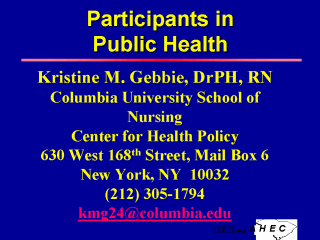 Kristine Gebbie joined the faculty of Columbia University School of Nursing in 1995, and is the Director of the Center for Health Policy. Her teaching and research are in health policy and health systems, with particular attention to population-focused prevention and public health systems. She currently has research funding from both the Health Resources and Services Administration and the Centers for Disease Control and Prevention. Prior to coming to New York, Dr. Gebbie served as the nation’s first National AIDS Policy Coordinator, a White House position created by President Clinton to coordinate national efforts in HIV/AIDS prevention, treatment and research. Prior to that she was Secretary of Health for Washington State and head of public health in Oregon. Dr. Gebbie’s earlier career was in academic health centers, as faculty member at UCLA School of Nursing and as faculty member and hospital administrator at St. Louis University School of Nursing and St. Louis University Hospitals. She has served on national committees advisory to the Secretary of the US Department of Energy as well as the Director of the Centers for Disease Control and Prevention. Dr. Gebbie is an elected member of the Institute of Medicine, the American Academy of Nursing,and the New York Academy of Medicine. She is also an active participant in a wide variety of national and international professional organizations. Dr. Gebbie’s extensive list of publications includes topics such as community mental health, mental health consultation, public health nursing, public health infrastructure, health policy and HIV/AIDS. In addition to many peer-reviewed journal publications, she has authored or co-authored several texts and book chapters and editorials. She writes a regular health policy column for the journal AIDS Reader, and serves on the editorial boards of the American Journal of Nursing, Journal of Public Health Policy and Journal of Public Health Management and Practice. |