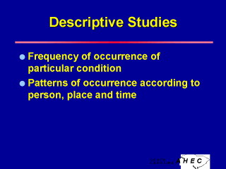 In Descriptive Studies, the epidemiologist is concerned with collecting information that characterizes and summarizes a health event or health problem. Routinely collected data from such sources as death certificates, hospital discharge records, health surveys (e.g., cross-sectional surveys) and disease surveillance programs are used for most descriptive studies. Characteristics related to “person” may include age, gender, race, ethnicity,marital status, socioeconomic class and occupation. Descriptive studies on occurrence of conditions according to place might involve examining their frequency within or between natural or political boundaries, urban versus rural localities, or latitude. Examination of “time” relationships can both identify and evaluate possible causes for changes in health conditions. |