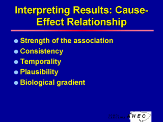 In general, there are five criteria that must be met to establish a cause and effect relationship. These are: Strength of association: Power and sample size must be sufficient to demonstrate a statistically significant difference. Consistency: Observation of the association must be repeatable in different populations at different times. Temporality: The cause must precede the effect. Plausibility: The explanation must be biologically plausible. Biological gradient: The presence of a dose-response relationship. |