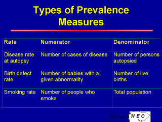 This chart shows several types of prevalence rates. All have in common a numerator that includes all cases (new and old) of the condition under study. Note: The term “period prevalence” is sometimes used to denote the number of existing cases plus new cases diagnosed during a given time period, divided by the total population. |