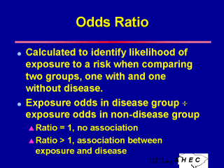Odds ratio is calculated to identify the likelihood of exposure to a risk when comparing two groups, one with and one without disease. It is calculated by dividing the odds of exposure in the disease group by odds of exposure in the non-disease group. A ratio of 1 means no association; greater than 1 indicates an association between exposure and disease For example, If the prevalence of smoking among lung cancer patients is 95 per 100, and the prevalence of smoking among people without lung cancer is 25 per 100, then Odds Ratio =95/ 25 = 3.8 Thus, there is an association between lung cancer and smoking. |