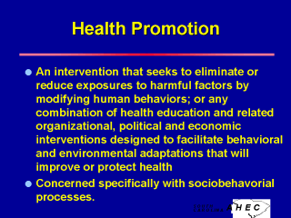 Primary Goal The primary goal of health promotion is to offer specific processes that will support individuals in practicing healthy behaviors. While people may understand the need to improve their health habits, many times they lack necessary resources in terms of motivation, discipline, or the specific knowledge which would enhance their efforts. Health promotion can provide resources to assist people in making lifestyle behavior changes. |