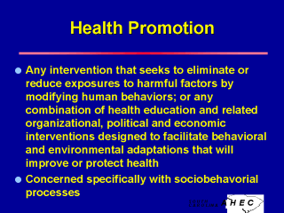 Primary Goal The primary goal of health promotion is to offer specific processes that will support individuals in practicing healthy behaviors. While people may understand the need to improve their health habits, many times they lack necessary resources in terms of motivation, discipline, or the specific knowledge which would enhance their efforts. Health promotion can provide resources to assist people in making lifestyle behavior changes. |