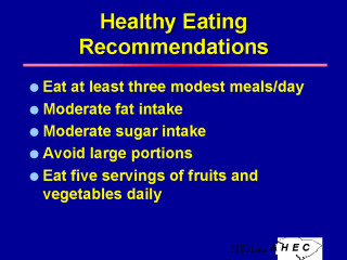 Nutrition (con’t) Many lowfat food items contain significant numbers of calories in the form of sugar, a fact of which consumers may not be aware. The consumption of soft drinks is another way that sugar intake has increased over the last decade. A 12oz soft drink usually contains from 8-12 teaspoons of sugar. Drinking two or three soft drinks in a day can really increase calorie intake. In addition, soft drinks often replace milk as a beverage among children and teens, decreasing the availability of important nutrients such as calcium and phosphorus. Recommendations for healthy eating include eating three meals/day, moderate fat intake, moderate sugar intake, avoid large portion sizes, and include five servings of fruits and vegetables. |