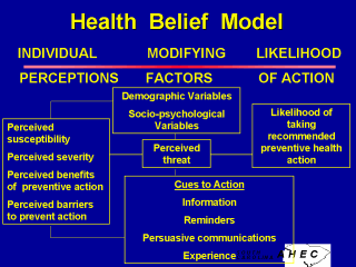 The Health Belief Model was developed in the 1950’s to help understand why more people did not take advantage of an immunization program offered by the federal government. ( Rosenstock, 1990 ) The model has stood the test of time and is often used today in planning health promotion programs and explaining the reasons that individuals may or may not adopt new health habits. The focus of the model is on adapting new behaviors in times when true medical care is not warranted. Notice that the core constructs of the model are based on perceptions; you may want to go back a few slides and review our discussion on beliefs and the role of perceptions. These categories of beliefs have been shown to be strong determinants of whether or not people will adopt preventive behaviors. We will discuss each of these in detail on the next slides.