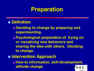 It is in this stage that people are really imagining themselves with a different behavior. They may begin to picture themselves with a slimmer body size or a fresher feel without smoking. They may begin to peruse quit smoking aids in the drug store or look on the Internet for information on dieting. Research shows these individuals will usually begin to actualize a change within a month. They begin making a plan, often mentally and privately, on how to change their habits. Preparers clearly see that the positives in making a change far outweigh the negatives but they have great anxiety that they will fail. Professionals target strategies to decrease anxiety as a primary focus with preparers.