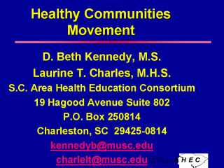 S. C. Area Health Education Consortium (843) 792-4431(office) (843) 792-4430 (fax) D. Beth Kennedy, MS is Director of Education for SC AHEC and an Associate Professor in the College of Health Professions at the Medical University of South Carolina. She holds a Master’s Degree in Biometry from MUSC and has been employed there for 21 years filling numerous evaluation, educational and administrative roles. In 1995 Ms. Kennedy completed a five-month training course on building healthy communities facilitated by Tyler Norris. She also participated in a three-year demonstration project of the Institute for Healthcare Improvement on applying continuous improvement to health professions education. Ms. Kennedy teaches leadership, continuous improvement, and over the past ten years, has participated in and facilitated strategic planning with the SC AHEC, the College of Health Professions, and Pro Hampton County (a Healthy Communities movement). Ms. Kennedy has written numerous grants, most recently the interdisciplinary training project now known as SCRIPT, which incorporates continuous improvement into its overall structure. Ms. Kennedy brings this expertise and experience to these public health modules. She also served as project director. Laurine Charles is an Associate Professor and the Coordinator of Academic Affairs and Diversity Officer in the College of Health Professions at the Medical University of South Carolina, and served as the Curriculum Consultant on this grant project. A Medical Technologist and Specialist in Blood Bank by training, she has been on the faculty at MUSC for 15 years. |