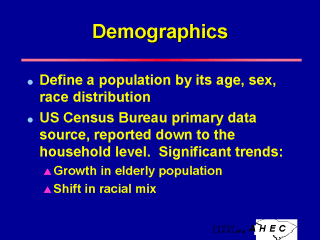 is expected to double its current size. The shifting of the racial mix of the United States is due to the increasing number of immigrants seeking to become permanent residents and the birth rates among these groups. By 2000, 30% of the US population will be foreign born. The most significant change will be in the minorities groups. It is estimated that by 2020, the largest minority group will be Hispanics, replacing African Americans which have historically composed the largest group of minorities. Within 100 years, 50% of all Americans will be Black, Hispanic, or Asian in origin. This has implications for businesses, social support systems, and health. US Census: Current Population reports - Population projections of the United States by Age, Sex, Race, and Hispanic Origin: 1995 to 2050. |
