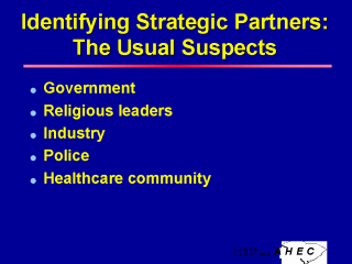 Often we think only those traditionally seen as experts or leaders can create change for improvements. These are some of those. However there are many leaders in a community that outsiders might not recognize. This is why we must understand where to look for community leaders that are “Not Your Usual Suspects”. Student Activity: Have students offer suggestions of where one might look for leadership in a community and discuss what these folks might bring as assets to the improvement of health. |