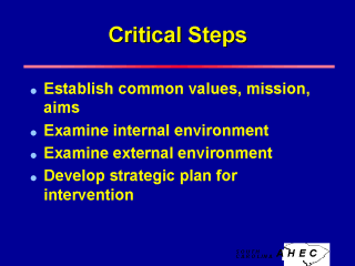 There are many ways to go about strategic planning, however, there are common elements that must be present for any quality strategic planning. It is imperative that a common set of values exist. Individuals must place value on the same ideas, conditions, concepts, and related morality. They should fashion a statement that addresses the mission and purpose (aim) of the strategic planning. It is important to remember to be inclusive and listen. Environmental scans of the internal and external environments provide the knowledge needed for planning. Examining the internal environment provides the view of the community which is to receive the benefits of the planning. Performing a SWOT analysis is a quick way to identify a community’s strengths, weaknesses, opportunities and threats. Asset mapping and guided dialogues are two of several tools that have been recently developed by the healthy communities movement to assist in the internal scan. Examining the external environment provides a broad view of the factors that might impact the achievement of the mission. We do not live in isolation, even in the most remote parts of the world. We are an interdependent universe and the environment of one small area can impact the world. For example, dramatic changes in the world’s rain forests have impacted global weather. Finally, plans are written to develop interventions aimed at improving the health of the population. |