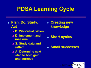 Some students may be familiar with CQI and have heard it referred to as the PDCA model (Plan, Do, Check, Act) . Stress that changes must be defined and measured. CQI processes are not expected to make earth-shaking changes but rather accomplish many small improvements with an occasional failure. However each cycle, if measured and studied, can create new knowledge and understanding. |