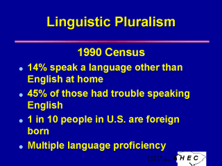 | Linguistic pluralism - According to the 1990 Census, 31.8 million U.S. residents, or 14% of the population, spoke a language other than English at home. Of these, nearly 45% indicated that they had trouble speaking English. - In some states, the percentage of those speaking a language other than English at home were much higher: 36% in New Mexico, 31% in California, and 20% each in Arizona, Hawaii, New Jersey, New York, and Texas. - The March 1997 survey by the Census Bureau revealed that one in ten persons living in the U.S. is foreign-born. - The U.S. and U.K. are the only two countries in the world that don’t require school age children to learn a second language. - Proficiency in multiple languages is increasingly important but not currently being addressed by the U.S. educational system. |