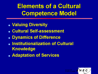 | Overview slide: The following section will discuss the elements of a cultural competence model. |