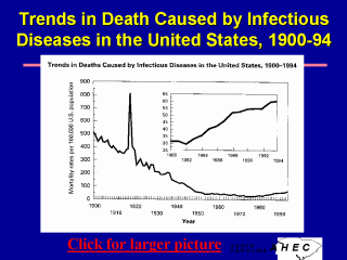 Infectious disease mortality in the United States decreased markedly during most of the 20th century. The sharp increase in 1918 and 1919 was caused by the influenza pandemic, which killed more than 20 million people world wide, including over 500,000 people in the US. Following World War II, it was widely believed that humans were winning the war against infectious microbes. Life threatening diseases such as tuberculosis and typhoid fever could be treated with antibiotics, and dreaded childhood diseases (polio, whooping cough, diptheria) could be conquered with vaccination. Coupled with improvements in urban sanitation and water quality, vaccines and antibiotics dramatically reduced the incidence of infectious diseases. But, in 1950, penicillin began to lose its power to cure infections caused by Staphylococcus aureus. In 1957 and 1958, new strains of influenza emerged in China and spread around the world. In the 1970’s, there was a resurgence of sexually transmitted diseases and new diseases identified in the US and elsewhere (Legionnaire’s Disease, toxic shock syndrome, Lyme’s disease). During the 1980’s, HIV emerged as a new infection and tuberculosis re-emerged in an antibiotic resistant form. Between 1980 and 1992, the death rate from infectious diseases increased 58%. The increase in drug resistance in strains of bacteria forced the US to return to the pre-antibiotic era in the battle against many common organisms, at the same time that new bacterial and viral pathogens were appearing. USDHHS (1998). Preventing Emerging Infectious Diseases: A Strategy for the 21st Century, Atlanta: Centers for Disease Control and Prevention. |
