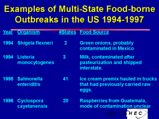 Food-borne illnesses are common and the majority of cases go unreported, but each year millions of people in the US get sick from them and thousands die. Clusters of related symptoms/illnesses may go undetected if individuals do not seek medical care, individuals seeking care do not submit diagnostic stool cultures, a physician does not report a positive stool culture, or if individuals are treated at different sites and not recognized as part of a cluster. An ongoing surveillance system is needed to collect information about cases to determine if a public health concern exists. Some organisms are more easily transmitted and have more severe complications. Public health intervention is needed to prevent further spread. The US has had several multi-state food-borne outbreaks including those caused by Cyclospora parasites on fresh raspberries, hepatitis A virus on frozen strawberries, and Escherichia coli 0157:H7 bacteria in apple cider, lettuce, alfalfa sprouts, and ground beef. Changes in food processing and distribution have resulted in more multi-state outbreaks in the US. The National Food Safety Initiative was created in 1997 to address food safety problems in the US. Additional examples are listed on the next slide. |