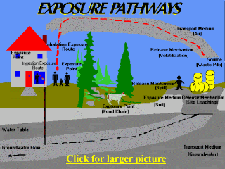 Several factors must be in place and connected for persons to be harmed by something in the environment. 1. A source of harm must exist, which has chemical and/or physical properties that make it persistent and/or transportable (volatile, water soluble) in the environment. 2. An environmental medium is necessary for transport: air, surface water or groundwater, soil, or combinations of the three. 3. A receptor population must be within the exposure pathway for harm to human health. Potential population exposures are important if the contaminant is persistent and land/property use changes over time. 4. Route of exposure.. Humans can be exposed to environmental contaminants via three routes: inhalation, ingestion, and dermal absorption. Inhalation requires the contaminant to be within the breathing space. Ingestion may occur through drinking contaminated water or milk, eating contaminated plants, animals, or soil. Dermal absorption requires direct contact with a contaminant that is capable of penetrating the skin. 5. The final ingredient for exposure is dose. There must be an adequate amount of the chemical to result in human harm. Almost any chemical can be harmful in large enough doses. We practice the dosing principle by careful instructions to patients regarding prescribed medications. The converse is also true; very small amounts of even the most toxic materials can do no or immeasurably small harm. |